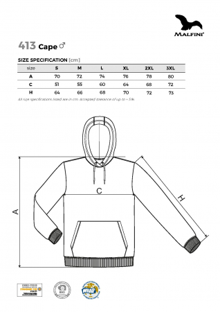 Kvalitní pánská trendová mikina s kapucí. Vnitřní strana výrobku je počesaná. Spodní lem a manžety rukávů jsou ze žebrovaného úpletu s příměsí elastanu. Specifikace: 65 % bavlna, 35 % PES, 320 g/m2 Tabulka velikosti