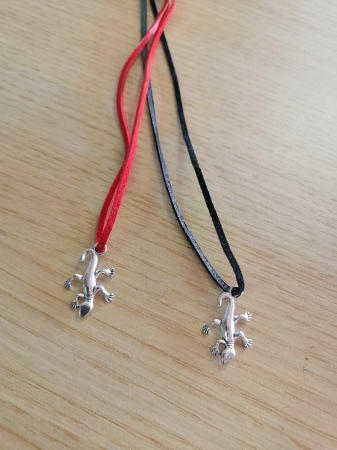 Přívěšek ve tvaru ještěrky z obecného kovu, ve stříbrné barvě. Zavěšen na kůži.