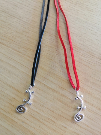 Přívěšek ve tvaru ještěrky, z obecného kovu, ve stříbrné barvě, zavěšen na kůži.
