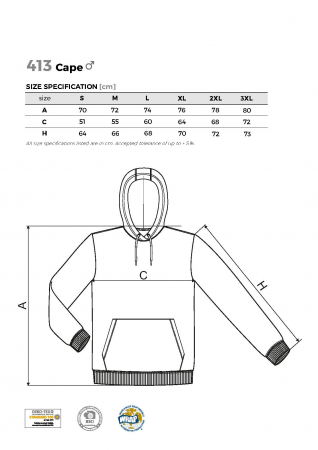 Kvalitní pánská trendová mikina s kapucou nastavitelnou stahovací šňůrkou a kapsou "klokankou". Vnitřní strana výrobku je počesaná. Spodní lem a manžety rukávů z žebrovaného úpletu s příměsí elastanu.