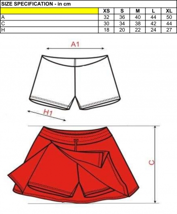 Dámská sukně s všitými kraťasy ze stejného materiálu. Materiál s přídavkem spandexu zaručuje stálý tvar. Stahovací šňůrka v pase. Střih sukně do tvaru A zajišťuje volný pohyb.